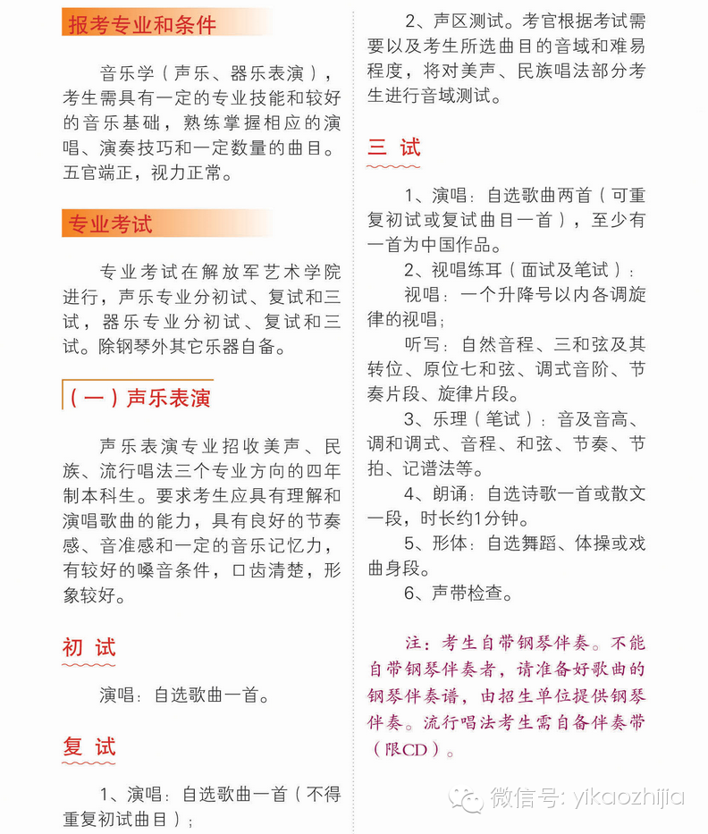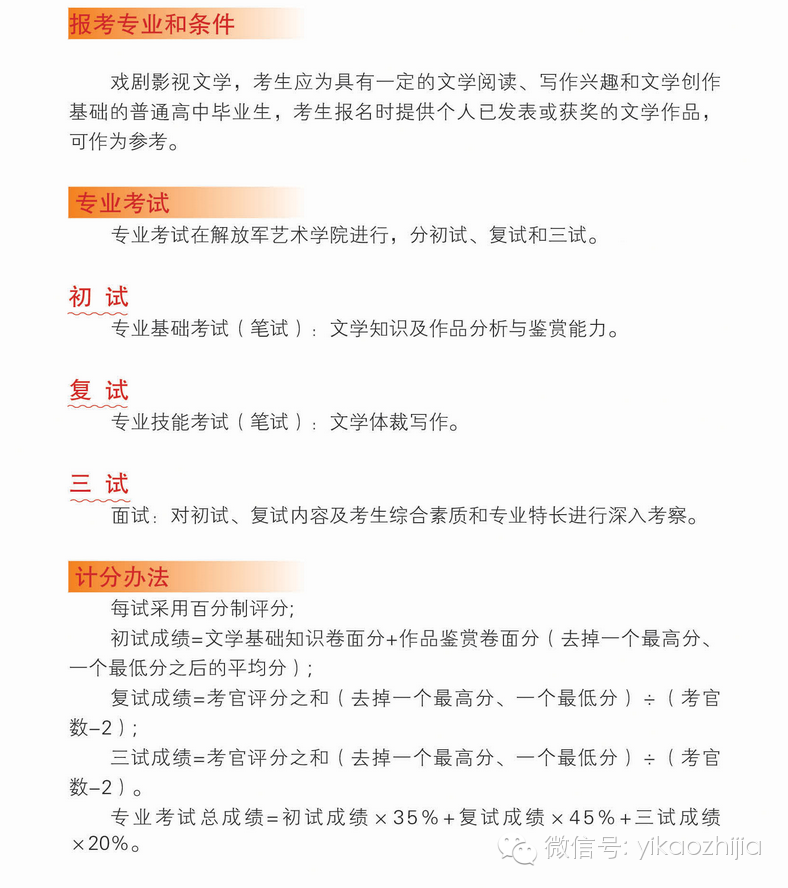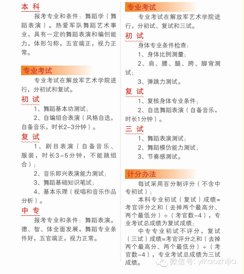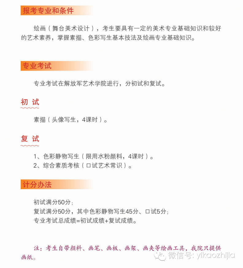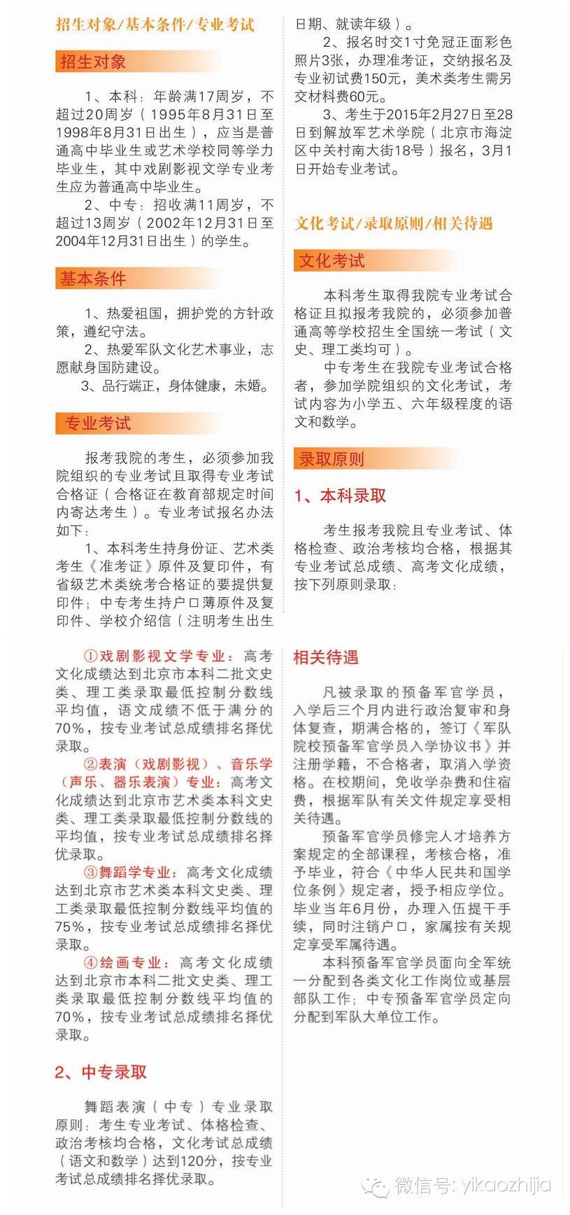 (六)我院是全国唯一的军队艺术院校,没有分校,不在外地设考点,不通过任何中介机构招生,不组织任何形式的考前培训,专业考试在我院(北京)组织,未参加我院专业考试的考生一律不录取。