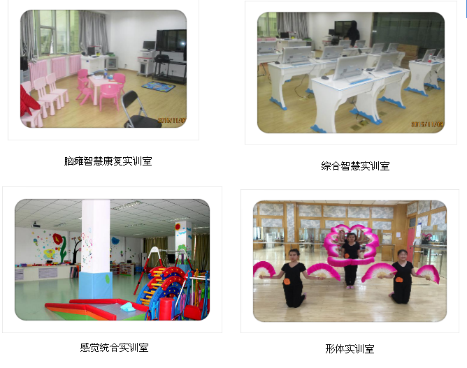 感觉统合训练实训室、脑瘫儿童康复训练实训室、音乐教育实训室、形体训练实训室、言语听觉康复实训室、绘画手工实训室、婴幼儿照护实训室。
