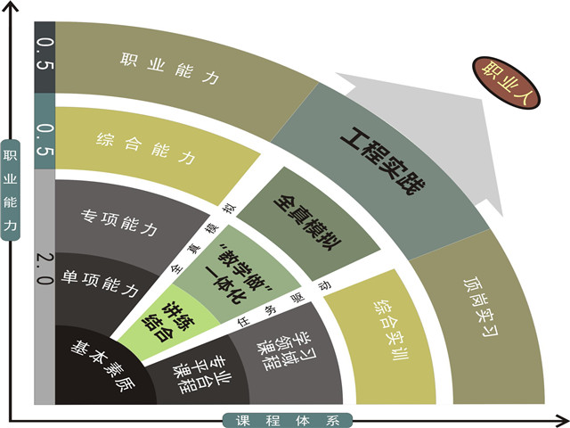 “2+0.5+0.5”中的“2”,是指在第1、2学年主要完成基本知识、单项能力和专项能力的培养;第1个“0.5”是指在第五学期完成从项目承揽到项目实施的全过程综合实训,培养学生的综合能力;第2个“0.5”是指在第六学期进行顶岗实习,培养学生的职业能力,完成由“学生”向“职业人”的过渡。