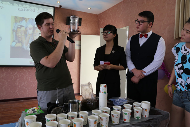 曾为美国星巴克咖啡师的外教Jim向大家展示制作咖啡的要领