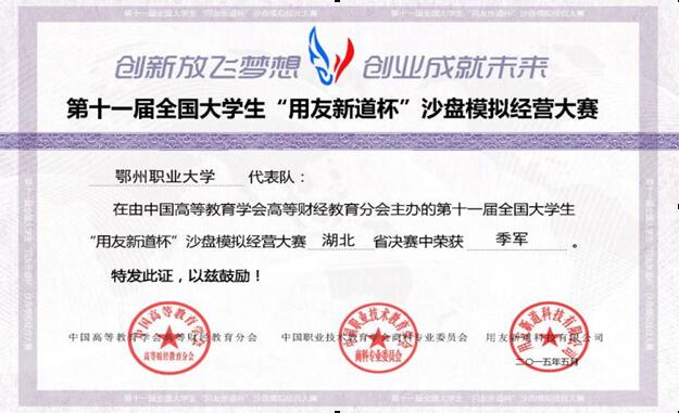 5 | 2015第十一届全国职业院校“用友新道杯”沙盘模拟经营大赛湖北赛区总决赛 | 2015年5月 | 湖北省鄂州职业大学代表队鄂州职业大学代表队二等奖 | 黄军生 李雪霞 |