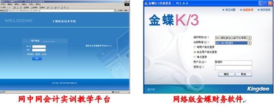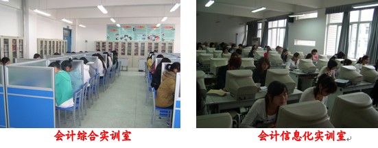 3.教学设施先进。现已建成会计综合实训室和信息化实训室,总面积达300平方米,总投资150多万元;配备有230台电脑、20组分岗实习设备,最新的企业网络版金蝶财务软件、用友财务软件、会计基础、会计实务、成本会计和报税等多种教学软件。