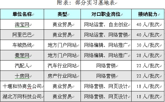 建立了稳定的校外实习实训基地。通过长期合作,现在稳定的、信誉良好的校外教学基地,如中国阿里巴巴网络有限公司、淘宝网站、易趣网站、十堰市京华超市有限公司、十堰市车城热线、十堰秦楚网站。