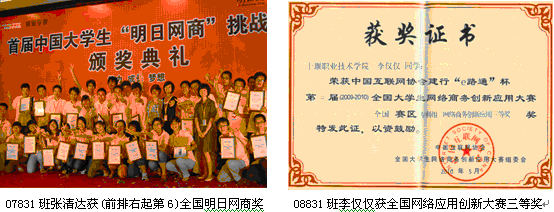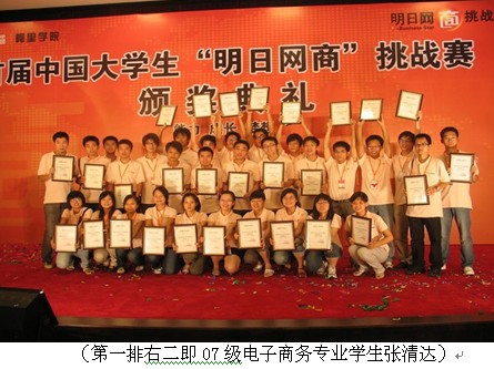 (2)07级电子商务专业张清达同学获中国大学生“明日网商”挑战赛的“网商新翼”奖。同时我院有20人进入200强,是参加比赛获奖人数最多的学校。