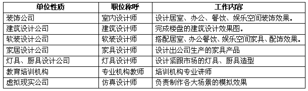 企业订单式就业,专业对口就业岗位安卓、百度所辖的室内设计公司、建筑设计公司、虚拟现实表现公司、家具设计公司、灯具厨具设计公司、设计院、广告传媒公司、相关教育培训机构、生产性企业的装饰部门,或者专业对口的各地装饰设计公司、建筑设计公司。毕业后可从事室内设计师、建筑设计师、虚拟现实表现设计师、等岗位工作,保障薪资4000--10000元。