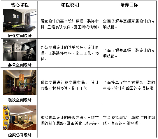 通过本专业的学习和训练,培养有一定艺术素养,掌握室内设计、建筑园林效果图制作和虚拟仿真模拟等方面知识,面向装饰公司、建筑设计公司、家具设计公司虚拟现实表现公司等企业单位,在生产、服务一线从事室内设计、室内施工技术与管理,装饰监理技术、管理工作,具有良好职业道德和职业生涯发展基础的高素质技能型专门人才。