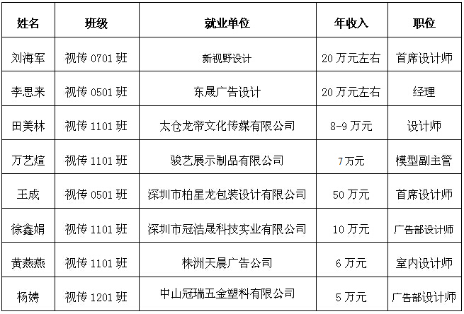 姓名 毕业时间 就业单位 职位 月收入 杨志平 2008.07 华菱湘钢集团 质管部组长 7500 唐 凯 2007.07 盘博科技有限公司 总经理 20000 赵文彬 2009.07 南车时代电气 设备部主管 7500 黎吾齐 2009.07 富士康科技集团 模具设计师 7000 李正江 2009.07 南车集团 技术班长 6500 陈 波 2010.07 吴江市凯模具精密模具厂 模具设计师 7000 周 兴 2011.07 宁波振弘精密模具有限公司 模具设计师 7500 朱 磊 2015.07 东莞杰思通讯股份有限公司 产品设计工程师 7000 宋 平 2015.07 扬明精密塑胶五金电子有限公司 模具设计师 6500 罗爱根 2016.07 深圳新安电器有限公司 产品设计工程师 6500 【实训场地】