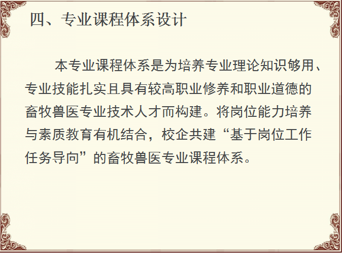 (二)坚持实施“理实一体、学训结合、双师教学”的人才培养原则; 坚持开展“做中学、做中教、顶岗实习”的专业教学模式; 推行“岗-课-证融合”的人才培养方案,改革教学内容和教学方法; 校企合作共同开发专业课程和教学资源; 将学校的教学过程和企业的生产过程相结合,突出人才培养的针对性和灵活性。