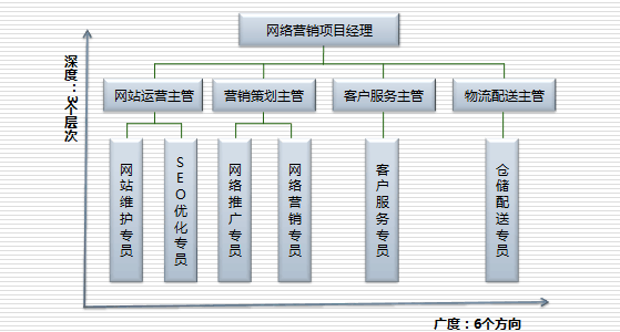 在网络营销岗位群的定位方面,我们依据企业实际运营情况、学生未来职业生涯规划,将网络营销岗位划分为基层、中层、中高层三个层次。基层岗位有网络营销推广专员、网站维护专员等六个;在职务空间提升方面,依次还有网络营销主管、网络营销项目经理。这样有利于学生未来职业发展,也为我们人才培养提供准确的方向。