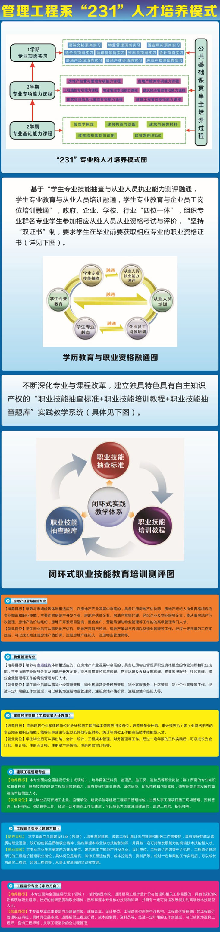系部按照“对接产业、校企合作、工学结合、双主体育人”这个理念,建设了自己的特色“123456”。“1”即一个目标:培养适应建筑工程生产一线的技术、管理职业岗位要求的高素质技术技能型人才;“2”即二个体系:理论教学体系与实践教学体系相互融通,双证融通;“3”即三个阶段:培养模式按基本能力培养阶段、综合能力培养阶段、顶岗能力培养阶段三个阶段培养;“4”即四项引入:引入企业能工巧匠,实训教学;引入行业企业标准,融入教学;引入技能抽查标准,贯穿教学;引入信息化,辅助教学;“5”即五岗实训:知岗、定岗、跟岗、模岗、顶岗实训;“6”即六项素质教育:专业知识和专业技能培养,职业态度培养,团队精神培养,人际沟通能力培养,语言表达能力培养,业余爱好与文体能力培养。