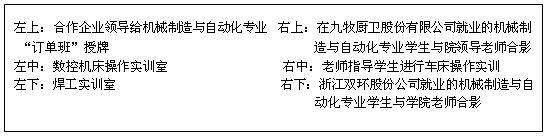 机械制造与自动化专业在2015年在湖南省职业院校技能抽考中合格率为100%。校内建有建筑面积4000平方米的机电实训中心、8000多平方米的实验大楼,拥有先进的数控加工设备和普通机械加工设备100多台,建有数控加工实训室、普通机械加工实训室、焊工实训室、钳工实训室、机械制图实训室、热处理实训室、硬度检测与金相分析实训室、液压与气压传动实训室、互换性与技术测量实训室、维修电工实训室、电子技术实训室、电子工艺实训室、机床电气综合实训室、自动化生产线实训室、PLC实训室、单片机实训室、工业机器人拆装实训室等校内实训基地,设备仪器总价值达1000多万元。