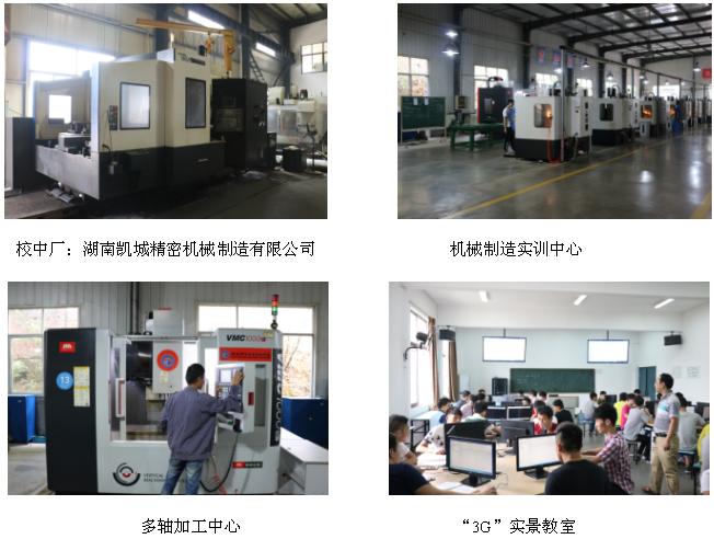 拥有面积近8000平方米的机械制造实训中心,其中数控车床12台、数控铣床12台、加工中心、多轴机床4台及其它普通车、铣、磨床等设备200余台;建有液压与气压传动、夹具设计、计算机辅助设计与制造等理实一体化教室10间、全省领先的3G实景专用教室;校内建有校中厂“湖南凯城精密机械制造有限公司”,校外与省内外知名企业上海大众长沙分公司、千山药机、云剑集团等建有实训基地。
