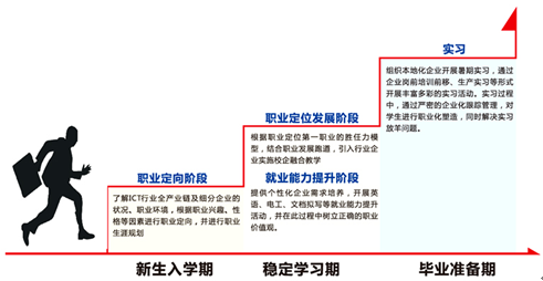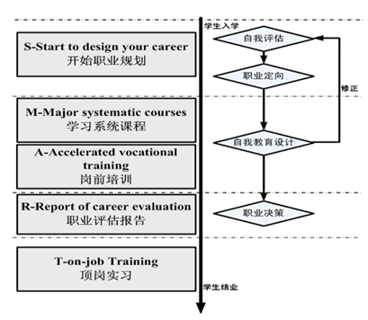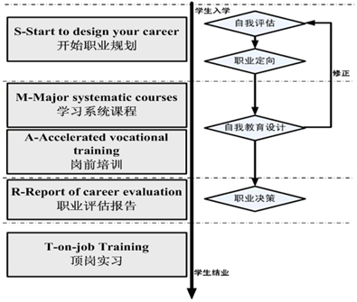 引入“中兴通讯S.M.A.R.T职业规划教育体系”(如图),为在校学生创造出与企业相似的模拟职业环境,引导学生进行职业规划设计、职业学习。与中兴通讯企业合作,在专业课程教学中开发一种能实现、以工作过程为导向、“岗位任务驱动型”的教学方法,为学生提供全新学习氛围。