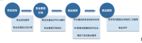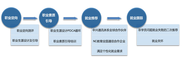 NC学院的毕业生将纳入以中兴通讯强大的供应链体系为依托建立的NC学员专属的就业支持体系(如图),在企业和学生之间建立最方便快捷的沟通渠道,最大限度促进毕业生就业。