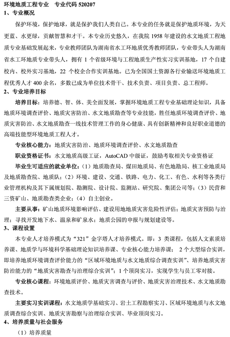 湖南省唯一开设此专业的高职院校,本专业培养德、智、体、美全面发展,掌握岩土工程技术基本理论知识和专业基本技能,具备岩土工程编录、原位测试、土工试验、工程制图、岩土工程勘察报告编写等基本能力,能从事岩土工程勘察、桩基础施工、地基处理、深基坑支护的施工和管理、边坡治理等一线岗位需要的具有综合应用各种手段和技能解决实际问题并具有创新能力的技能型人才。
