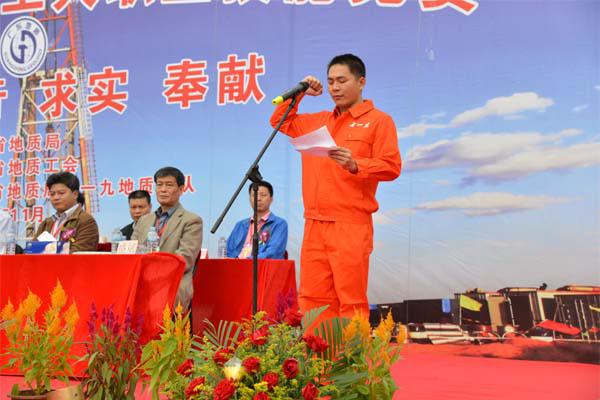 (图9 刘华龙同学在广东省钻探工职业技能竞赛中代表参赛队员宣誓)