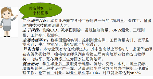 国土资源调查与管理专业于2008年开始招生,面向湖南省及中南部地区面向国土资源、土地、测绘、房产、建设等行业领域生产一线,培养从事土地调查与测绘、土地规划与整理、土地管理、不动产权籍调查与测绘、不动产登记发证、土地信息建库、工程测量等岗位需要的高素质技术技能型人才。
