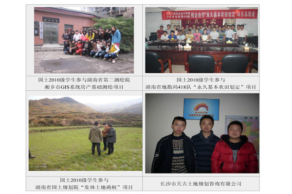 专业自开办以来,先后与湖南省第二测绘院、湖南省国土规划院、湖南省地勘局418队、长沙市天吉土地规划咨询有限公司、长沙市地腾土地规划咨询有限公司等企事业单位合作开展校企合作,参与到国家“GIS系统房产基础测绘”、“永久基本农田划定”、“集体土地确权发证”等项目中,取得了良好的社会效益和经济效益,实现了企业、学校、学生的“三方共赢”。