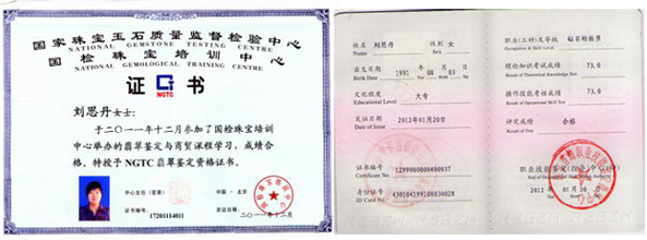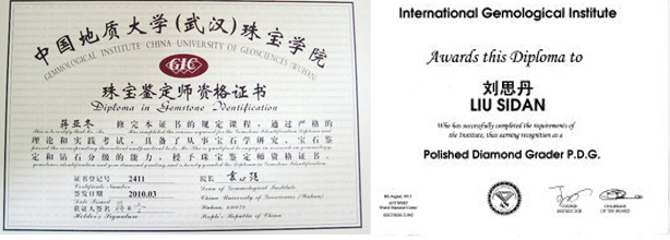 职业资格证书:中/高级宝玉石检验员、中/高级钻石检验员、珠宝首饰营业员、中国地质大学(武汉)珠宝学院(GIC)等职业资格证书。