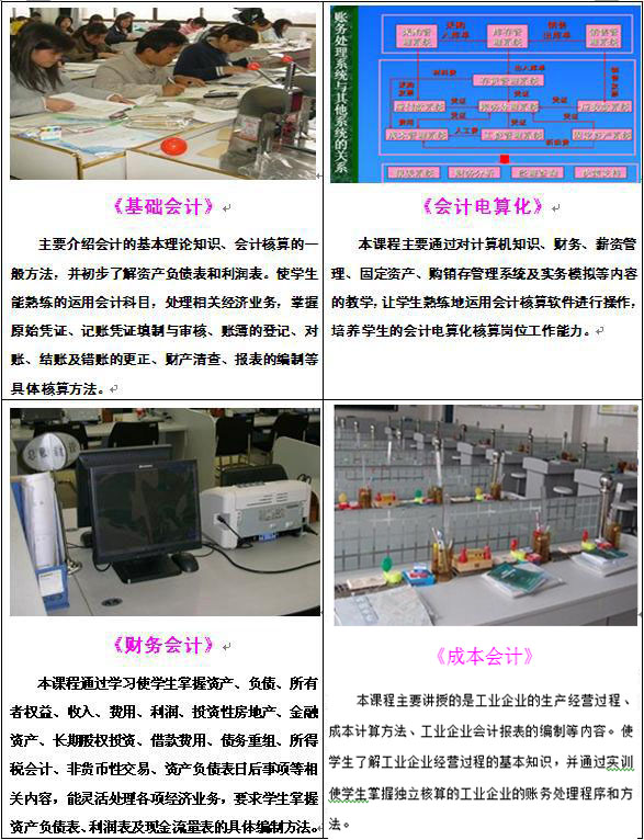 1、专业2004年被确定为“湖南省改革试点专业”,2007年立项为“湖南省精品专业”,2011年获得了“中央财政支持专业发展”项目。2、以“工学结合”为原则,完善的校企共育的人才培养模式3、基于工作过程的“教学做一体化”的专业课程体系课程体系的设置体现出以职业能力和专业岗位能力为需要,以职业素质和能力培养为目标,淡化以学科设课框架,形成“教学做一体化”的课程教学模式。4、专兼结合的“双师型”教师团队现有专职教师32人,兼职教师20人。专职教师中省级专业带头人1人,省级青年骨干教师5人,教授、副教授职称有19人,占专职教师的60%,同时具有注册会计师、注册税务师、高级会计师、会计师、理财规划师、经济师、高级考评员、中级考评员等职业资格证的“双师型”教师25名,占专职教师比率为78%。5、充足的实训教学条件先后与湖南省供销合作总社、深圳安居企业会计代理有限公司、中联重科股份有限公司、湖南友谊会计师事务所等多家企业单位建立了长期的合作关系,形成了稳定的、运行良好的校外实训基地45处。现有会计手工实训室、用友会计电算化实训室、金蝶会计电算化实训室、会计分岗位综合实训室、税务会计实训室、ERP沙盘实训室、财务管理实训室、证券投资实训室、仿真财务室等18个。注册成立了祥龙会计服务公司。构建了高职会计专业立体化的实训体系,并运用到人才培养之中。