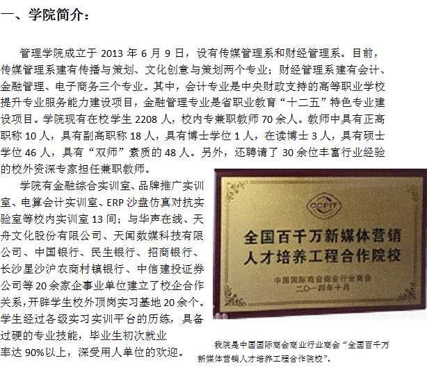 戏剧影视表演:是中央财政支持的国家骨干院校重点建设专业、省级精品专业。主要面向影视媒体、演艺团体、影视制作公司和群众文化推广机构,培养表演基本功扎实、角色塑造能力强,具有相应的文化素质和较强学习能力;能够胜任话剧演员、影视剧演员、群众文化艺术馆(站)文艺专干等岗位,具有良好职业道德、团队合作精神、较强实践能力、可持续发展的技术技能人才。主要开设:表演基础、艺术语言表达技巧、人物语言表达技巧、戏剧片段排演、戏剧作品排演、形体表演、歌曲演唱等课程。近年来,该专业不断创新,打造原创精品剧目,多次在社会公演,专业影响力不断提升。