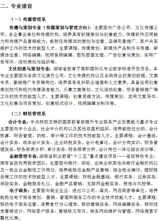 播音与主持:是中央财政支持的国家骨干院校重点建设专业;湖南省高职院校示范性特色重点建设专业;省级教学改革试点(重点)专业。主要为广播电台、电视台和影视制作公司及相关单位培养以主持与播音技能为主,兼有一定采编能力的高素质技术技能型人才。主要开设:普通话语音与发声、播音创作基础、播音艺术、影视表演艺术、节目主持艺术、文艺作品演播、新闻写作与采访、电视摄像等课程。该专业已与十多家广播电台、电视台、音像出版社、传媒公司等签订项目合作协议,大力开发校内外实践基地的合作平台,目前已实现了联合办台、合办节目、岗位教学、师生顶岗工作、承接生产性实践等项目。