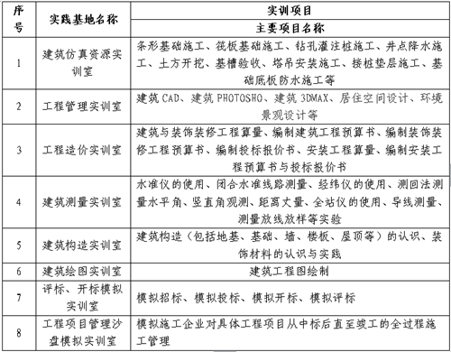 为了保证实践教学的顺利进行,充分满足实践教学的需要,我们充分利用行业和企业的社会资源,与22家建筑行业相关企业的实践教学基地保持着长期稳定的合作关系,待建筑工程技术专业开办后,可满足学生实训和顶岗实习的需要。具体校外实习基地情况如下: