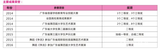 办学成果:第一届广东省学前教育专业大学生技能大赛二、三等奖;连续三年主办高质量学前教育专业毕业晚会;校内外专业实训、实习基地10多个;拥有学院唯一专业独享的“蓓蕾教育奖学基金”。