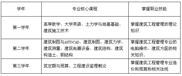 培养目标:本专业培养德、智、体全面发展的、具有建筑工程管理能力,面向第一线的高等应用型专门人才。学生通过三年的理论学习和技能实训,成为获得施工员、预算员、监理员的基本素质初步训练的房屋营造高级技术应用型人才。毕业生主要去工程建设第一线,从事建筑工程施工技术与管理工作、工程造价管理工作或建筑工程监理工作。