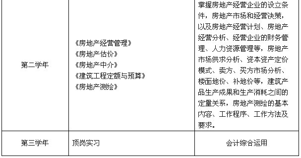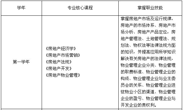 培养目标:本专业面向房地产行业,培养与我国社会经济建设发展要求相适应,德、智、体、美、劳全面发展,具有良好的职业道德,掌握房地产市场开发与经营、价格评估基本理论,熟悉国家房地产相关法规,熟悉房地产开发、经营、估价的高级管理专门人才。