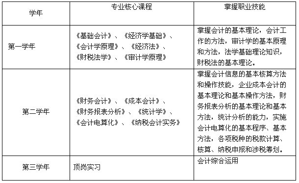 培养目标:本专业培养德、智、体、美全面发展的、具有良好的职业道德和敬业精神以及相应的管理沟通与协调能力,掌握会计和审计的基本理论和基本知识,能熟练运用会计、审计方法,从事企业财务会计与审计、建筑项目预决算、编制与审计、企业内部控制及其他相关工作的高级技术应用性专门人才。