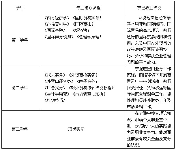 培养目标:本专业主要面向对外经济贸易企业、外商投资企业、外国驻华商务机构、各企事业单位、社会团体等单位的外操作和管理等岗位。培养较好国际贸易专业知识和操作技能的复合型涉外高等技术应用型人才。