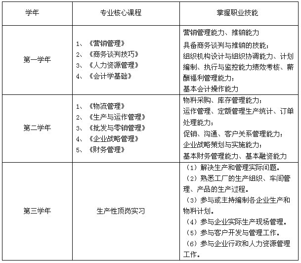 主要课程:经济应用数学、西方经济学、现代营销原理、会计学原理、经济法概论、广告学、市场调查与预测、专业英语、销售管理、商务谈判、消费者行为分析、现代推销学、渠道设计与管理、市场营销策划等。
