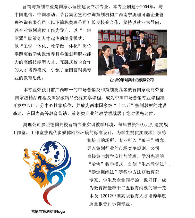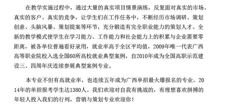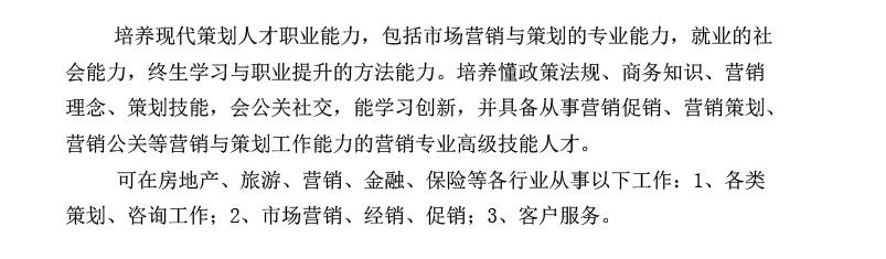 培养目标:培养现代策划人才职业能力,包括市场营销与策划的专业能力,就业的社会能力,终生学习与职业提升的方法能力。培养懂政策法规、商务知识、营销理念、策划技能,会公关社交,能学习创新,并具备从事营销促销、营销策划、营销公关等营销与策划工作能力的营销专业高级技能人才。