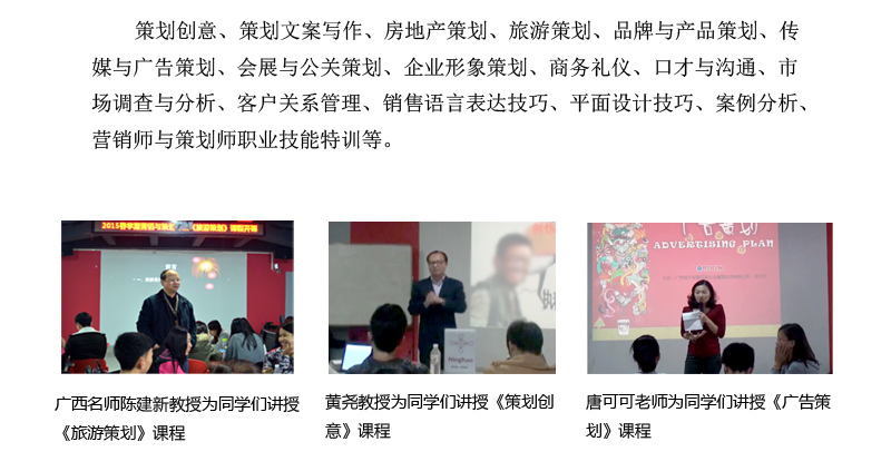主要课程:策划创意、策划文案写作、房地产策划、旅游策划、品牌与产品策划、传媒与广告策划、会展与公关策划、企业形象策划、商务礼仪、口才与沟通、市场调查与分析、客户关系管理、销售语言表达技巧、平面设计技巧、案例分析、营销师与策划师职业技能特训等。