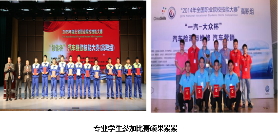 本专业学生在各级各类职业技能大赛中成绩优异,我院汽车检测与维修专业是唯一连续六年代表湖北省参加全国职业院校技能大赛“汽车检测与维修”赛项比赛的团队,成绩一直突出,共获一等奖3项,二等奖6项,三等奖8项,已是全国知名,省内一流。在2015年湖北省职业院校技能大赛(高职组)汽车检测与维修赛项中,获得团体一等奖的优秀成绩。这些成绩在湖北所有开设汽车专业的高职类院校中是唯一的,在全国名列前茅。在长安福特校企合作定向班2013年、2014年和2015年连续三年技能大赛中,也一直是合作院校中的佼佼者。