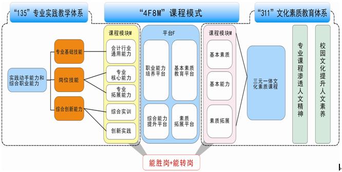 会计专业形成了“岗课证融合、教学做一体”的人才培养模式;围绕人才培养模式,建立起以“四平台八模块”(简称“4F8M”)课程模式为主体,以“135”专业实践教学体系和“311”文化素质教育体系为两翼的人才培养模式支撑体系(简称“一体两翼”),形成了“能胜岗+能转岗”的高素质、强技能、善创新、可持续发展的技术技能型人才培养目标,努力使培养出来的学生既能胜任会计职业岗位,又能在岗位发生变化的情况下,有继续学习的基础,很快适应新的岗位,有发展后劲。