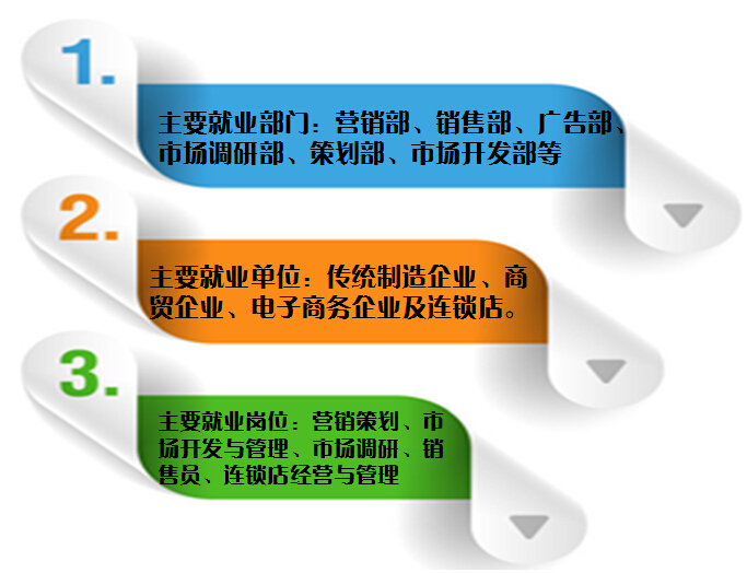 主要培养适应区域经济发展需要和满足行业发展需求,具有敬业精神、创新精神和较强实践能力,具有较高职业道德水平;掌握社会活动和专业岗位工作所需要的文化知识,掌握市场营销、经济、金融、管理等专业知识,拥有现代市场营销理念和技能,面向各类企事业单位和各类金融机构一线岗位,从事企业形象设计、产品营销策划、产品市场推销等工作的高级应用型人才。