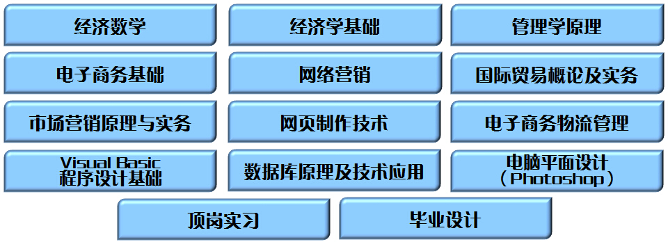 本专业是融计算机信息科学、管理学、市场营销学、商务贸易和现代物流于一体的新型交叉学科。采用四平台八模块(简称4F8M课程体系)课程结构,改革了专业实践课程结构体系,将专业实践教学项目分为课程实习、职业岗位认知实践、企业岗位综合实训、毕业设计或毕业论文、专业技能考核等模块,强化学生实践动手能力训练,落实工学结合,校企合作,讲训并重,学练结合的培养模式,形成“岗课证”对接的课程体系。
