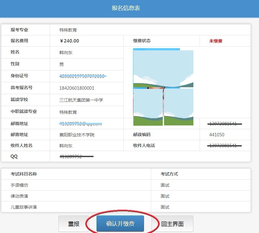 6、确认并缴费。点确认并缴费即可以按提示完成缴费手续。完成全部报名流程后实名申请加入襄职2019单招考生群QQ群:526597009(本群只接收已完成网上报名考生加入)。