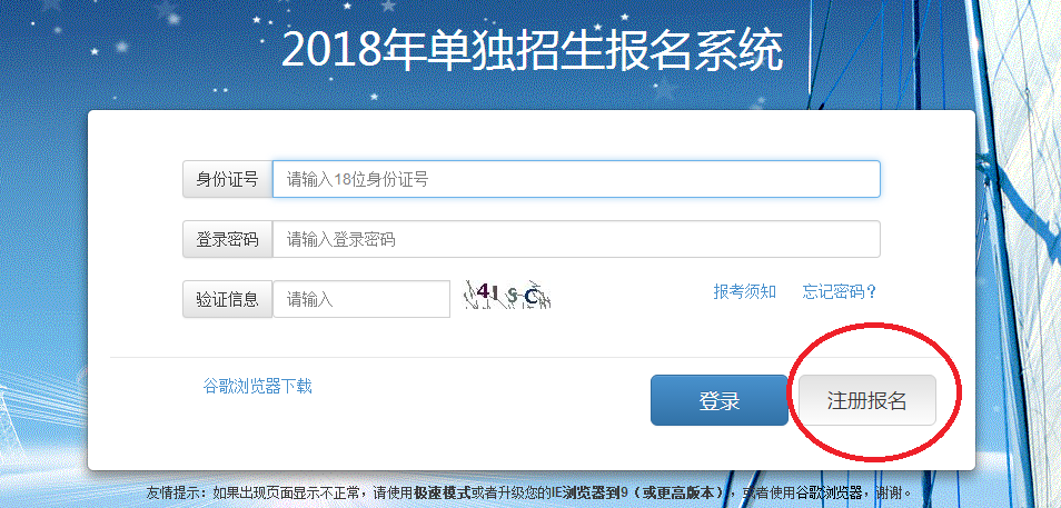 2、进入单独招生报名页面。点击注册报名。