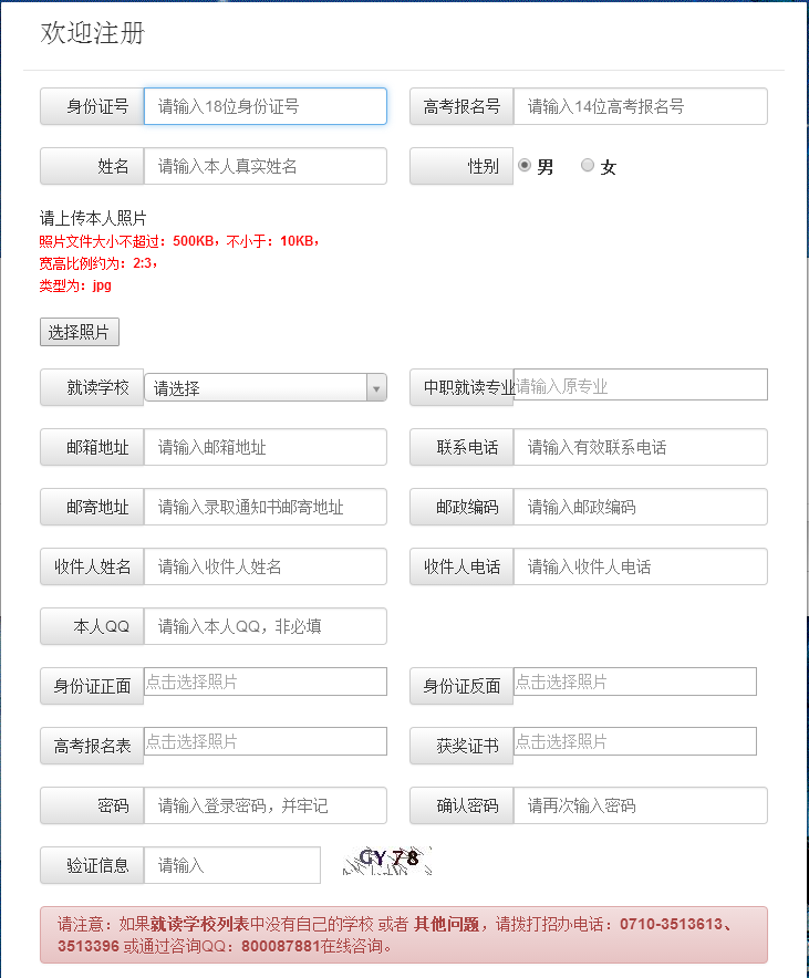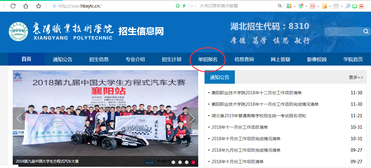 1、输入http://zsxx.hbxytc.cn/登陆学院招生信息网。点击单招报名,登陆报名系统。
