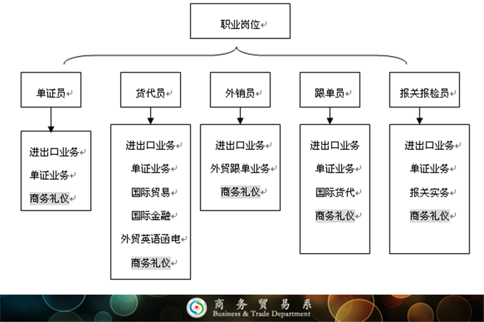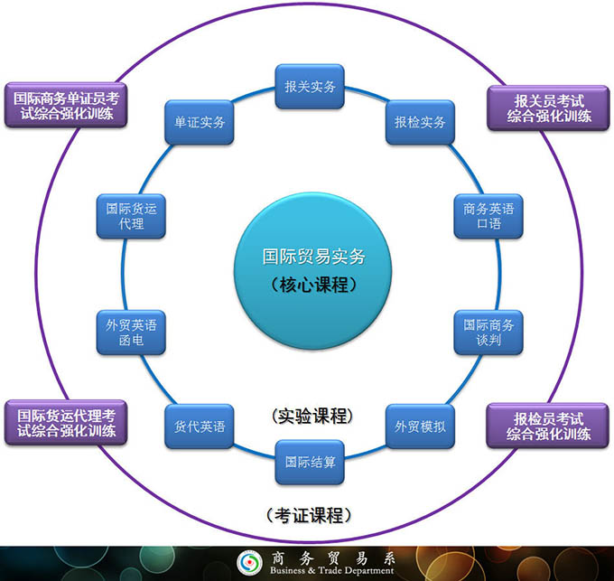 国际贸易实务、外贸函电与单证、国际结算、报关与报检实务、国际商法、国际货物运输与保险、国际货运代理。