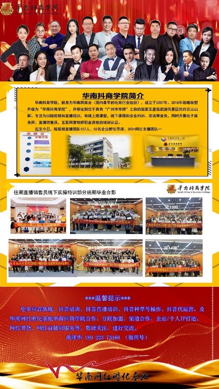 通过严苛的选拔制度组建专业名师团队。华南网红孵化基地华南抖商学院56名直播销售员培训讲师团队均来自全国知名直播平台,直播实操经验丰富,对互联网营销具有深入地研究。